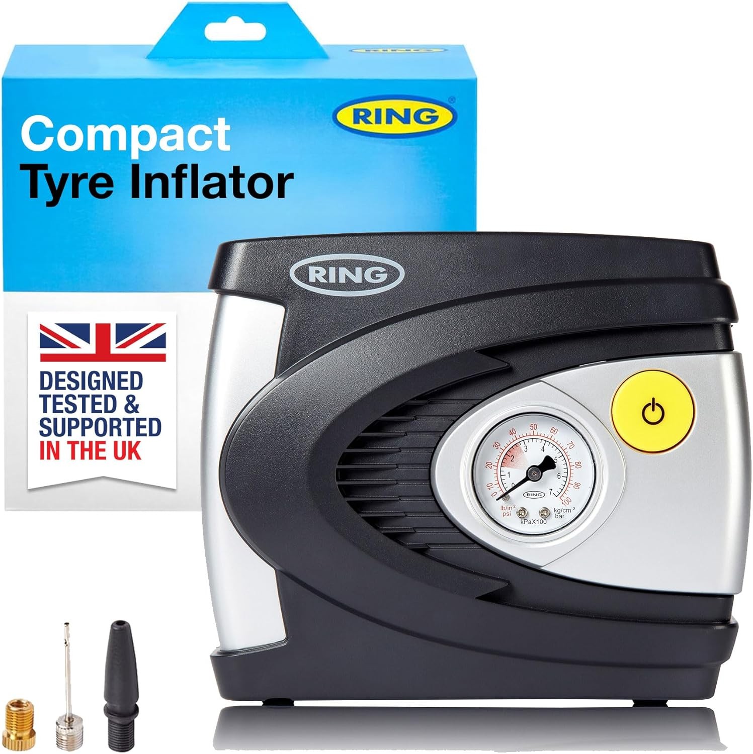 RING TYREINFLATE 10 Analogue Tyre Inflator Air Compressor with Three Adaptors - Measures in PSI, BAR and kPA