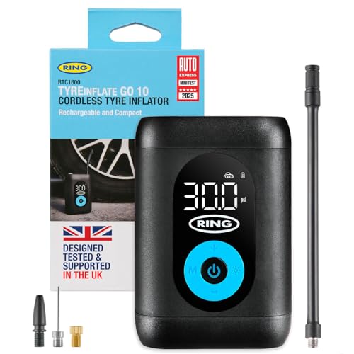 RING TYREINFLATE GO 10 Compact Cordless Tyre Inflator Air Compressor with Three Piece Adaptor Kit - Measures in PSI, BAR and kPA