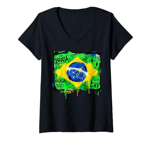 Women's Brazil Flag Graffiti Spray Paint Brasa Rio Streetwear V-Neck T-Shirt
