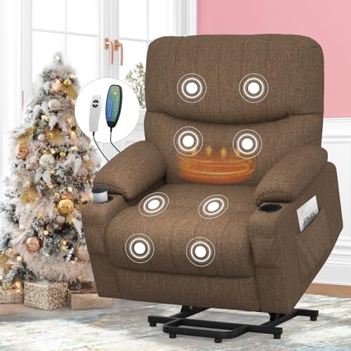 MCombo Riser Recliner Chairs for Elderly, Electric Power Recliner Armchair for Living Room, Brown Lift Chair with Heat & Massage, Extended Footrest, USB Ports, Fabric 7040 (Brown, Medium)