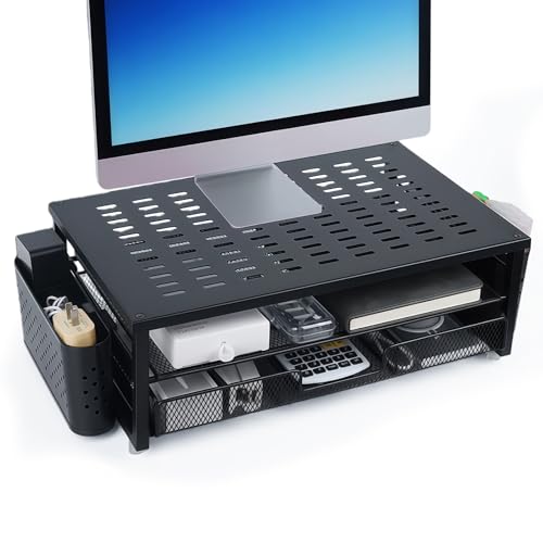 CHUNGG Monitor Stand Riser with Storage, Desk Monitor Stand with Drawer and 2 Pen Holder Office Accessories, Computer Desk Organizers Riser, for Laptop, Printer, Computer ( Black )