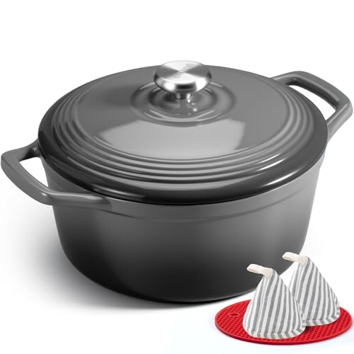 Overmont 26cm/5.2L Enamelled Cast Iron Round Casserole Pot With Lid Cookbook & Cotton Potholders - Non-stick Dutch Oven Cookware for Braising, Stews, Roasting, Bread Baking - Grey, 5.5QT