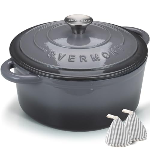 Overmont 26cm/5.2L Enamelled Cast Iron Round Casserole Pot With Lid Cookbook & Cotton Potholders - Non-stick Dutch Oven Cookware for Braising, Stews, Roasting, Bread Baking - Grey, 5.5QT