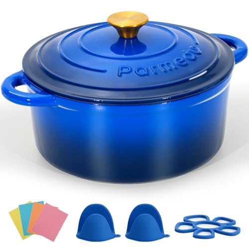 Parmedu Enameled Cast Iron Pot: 5L Heavy Duty Dutch Oven with Lid and Dual Handles in Blue - Silicone Accessories and Sponge Included, Ideal for Braising, Stewing, Roasting and Baking, Christmas