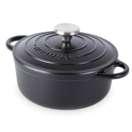 Nuovva Enamelled Cast Iron Dutch Oven Pot with Lid – 2.1 Quart Casserole Dish – Ceramic Dutch Oven for Bread Baking, Roasting, Braising & Stews – Oven Safe up to 500°F – 20cm Black