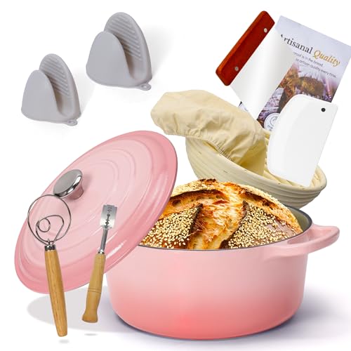 Enameled Cast Iron Dutch Oven with Proofing Basket, Non-Stick Ovenproof Casserole Pot, Pink Dutch Oven for Braising, Stews, Roasting & Bread Baking 5Litres-26cm