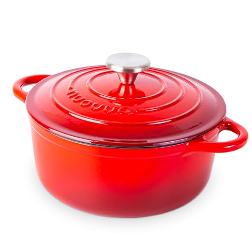 Nuovva Enamelled Cast Iron Dutch Oven Pot with Lid – 3.1 Quart Casserole Dish – Ceramic Dutch Oven for Bread Baking, Roasting, Braising & Stews – Oven Safe up to 500°F – 22cm Red