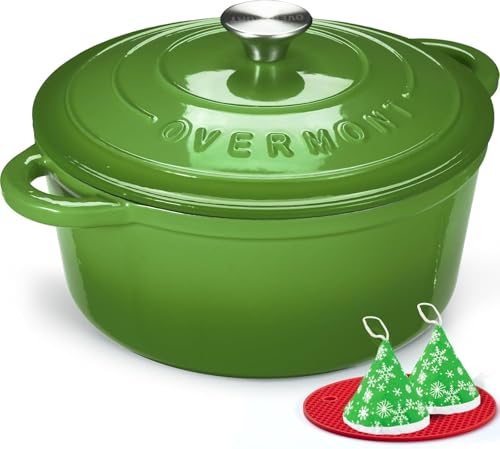 Overmont 26cm Enameled Cast Iron Dutch Oven - 5L Pot with Functional lid Cookbook & Cotton Potholders - Oven Safe up to 500° F, Sturdy Cookware for Braising, Stews, Roasting, Bread Baking, Green