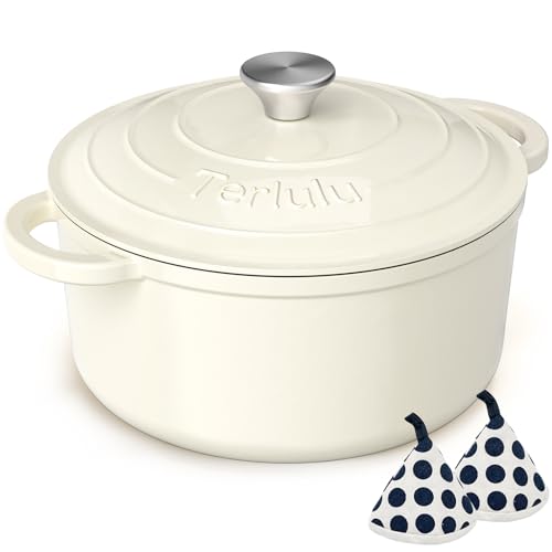 Enamelled Cast Iron Round Casserole Pot with Lid & Cotton Potholders - 26cm 4.75L Non-Stick Dutch Oven - Sturdy Dutch Oven Cookware for Bread Baking, Braising, Stews, Roasting - Cream White, 5QT