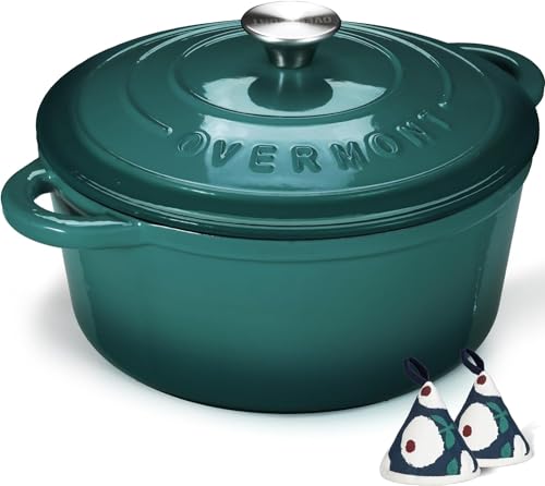 Overmont 26cm/5.2L Enamelled Cast Iron Round Casserole Pot With Lid Cookbook & Cotton Potholders - Non-stick Dutch Oven Cookware for Braising, Stews, Roasting, Bread Baking - Forest green, 5.5QT