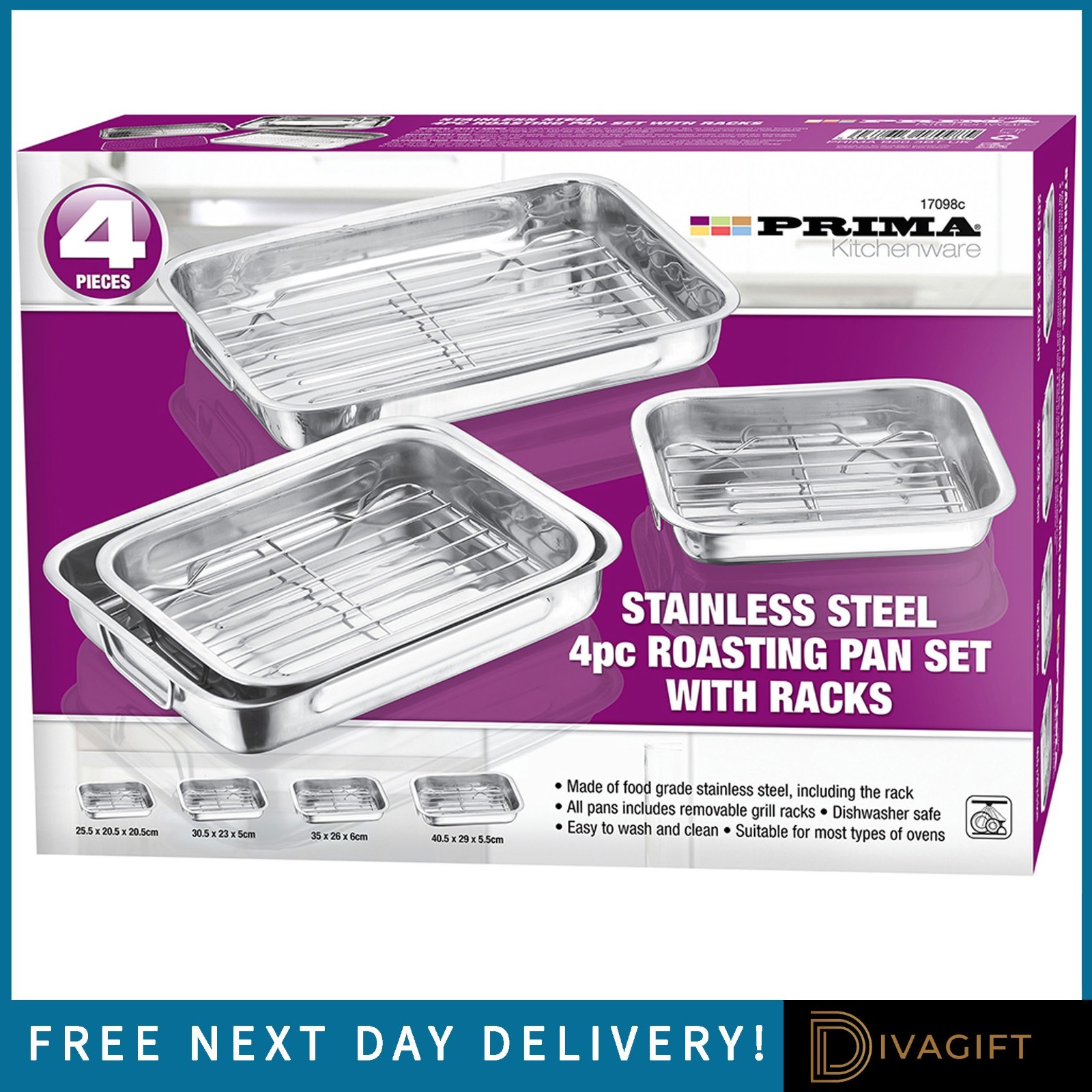 PRIMA 4PCS STAINLESS STEEL ROASTING OVEN TRAYS TINS DISH SET ROASTER RACK PANS