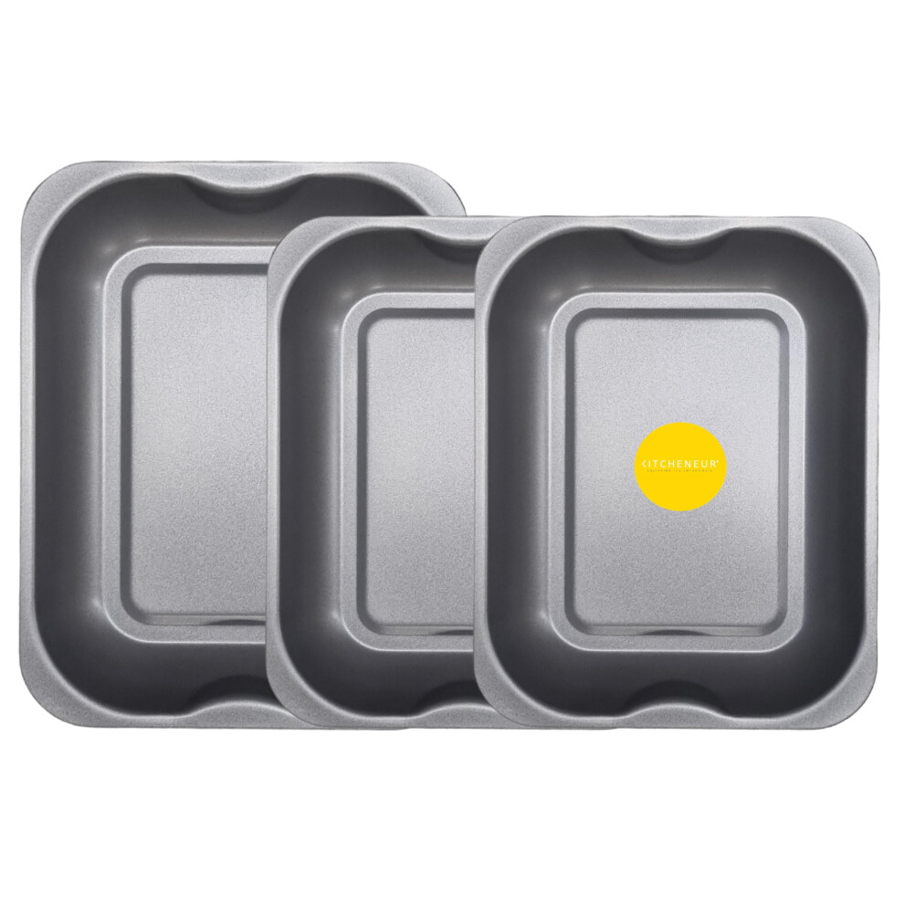 Kitcheneur 3-Pack Deep Roasting & Baking Tray Set x2 Medium (33cm) & x1 Large (38cm) Non-Stick Roasting Tins for Ovens - Durable, Multi-Purpose Oven