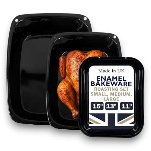 Great British Bakeware Vitreous Enamel Roasting Tray Set - 28, 33, 37cm Baking & Roasting Tray, Heavy Duty Vitreous Enamel Bakeware, Cookware Set, Made in England, Scratch Resistant