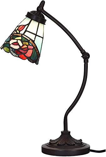 Bieye L30759 Rose Flower Tiffany Style Stained Glass Rocker Arm Desk Lamp Night Light with 5 inch Wide Lampshade for Working Reading Table, Green Red, 19 inch Tall