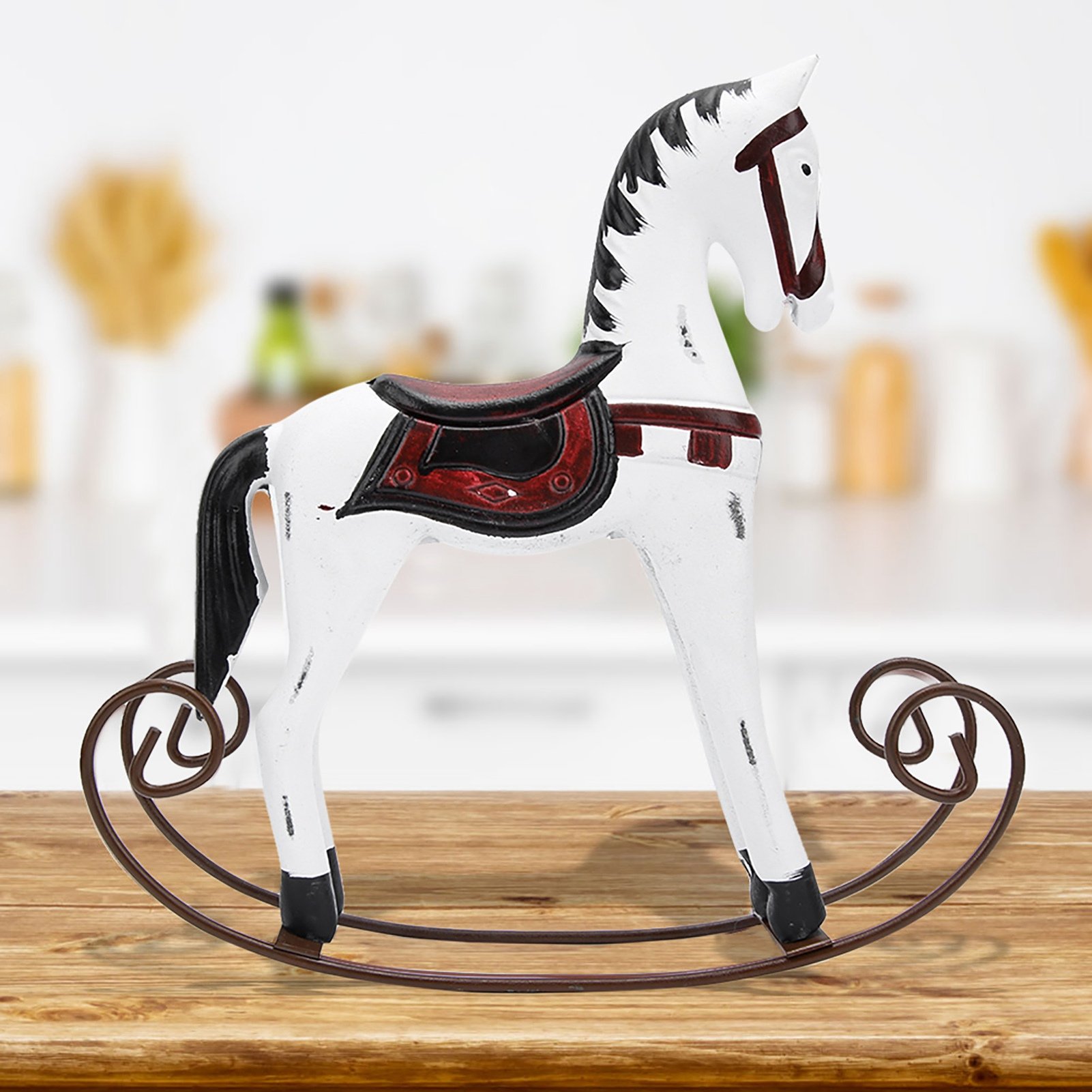 (Warm White, One size) Wooden Rocking Horse Kids Toys Desktop Ornament Childhood Memory Home Decor - Red