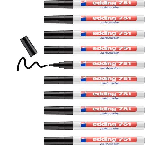 edding 751 paint marker - black - 10 pens - round tip 1-2 mm - paint marker for marking and labelling metal, glass, rocks or plastic - heat-resistant, permanent, smudge-proof and waterproof