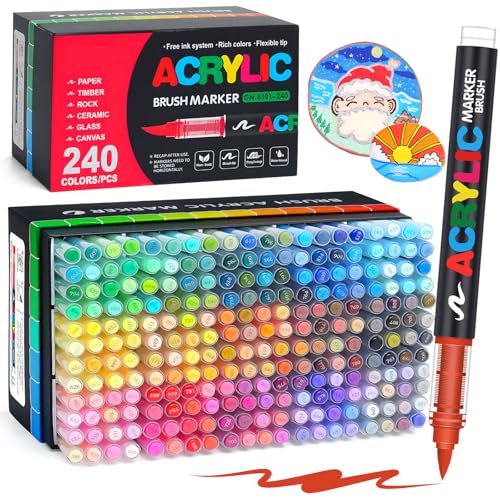 240 Colours Acrylic Paint Pens Set, Water-Based Acrylic Brush Markers, Brush Tip Paint Pens for Art, Crafts, Canvas, Rocks, Wood, Glass, Non-Toxic, Quick Dry, Smooth Writing for DIY & Artists