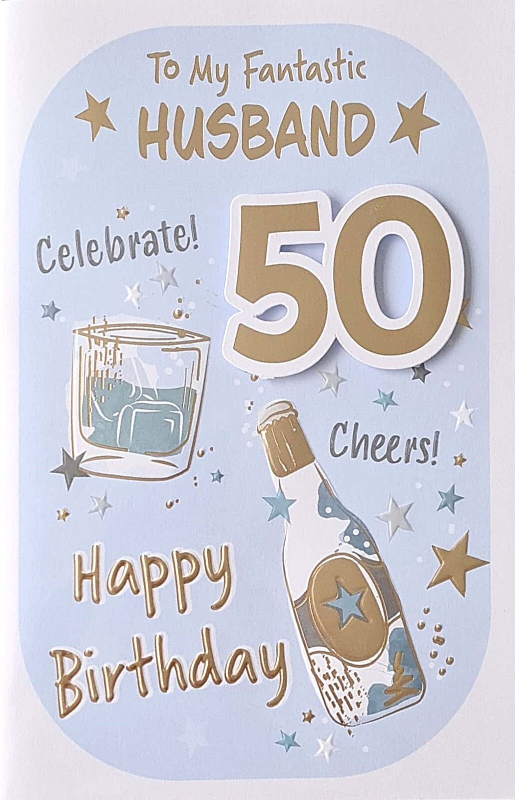 Happy 50th Birthday Card to my Fantastic Husband Rocks Glass Beer Bottle Cheers