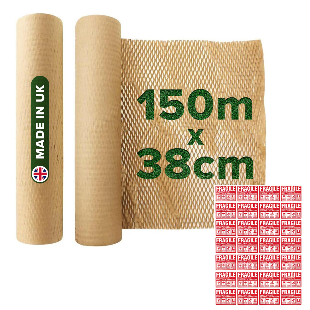 Honeycomb Sustainable thick Paper Packaging Roll 38 cm x 150 M, Eco-Friendly* Brown Craft bubble wrap cushioning for Breakables, Packing, Fragile, Shipping, Moving House, Gift. Proudly made in the UK