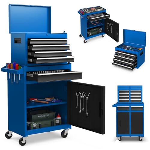 GiantexUK Tool Cabinet, 2 in 1 Lockable Metal Tool Chest with Removable Top Cabinet, Wheels, 5/6 Drawers, Pegboard & Hooks, Heavy-duty Rolling Tool Box Trolley (with Adjustable Shelf, Black + Blue)