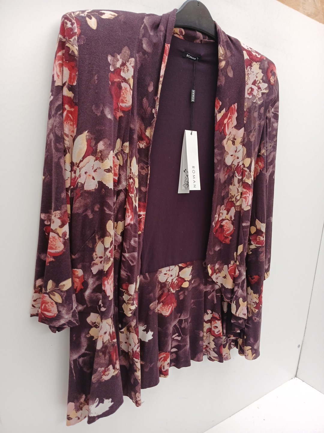 Roman size UK 16 Purple Floral Peplum 3/4 Sleeve Top with Waterfall Front BNWT.