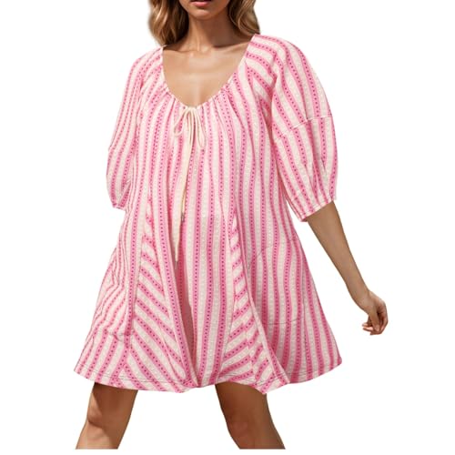 Playsuits For Women Uk Summer Rompers For Women Casual Striped Puff Short Sleeve Adjustable Neck Wide Leg Oversized Jumpsuit With Pockets (Red Xl)