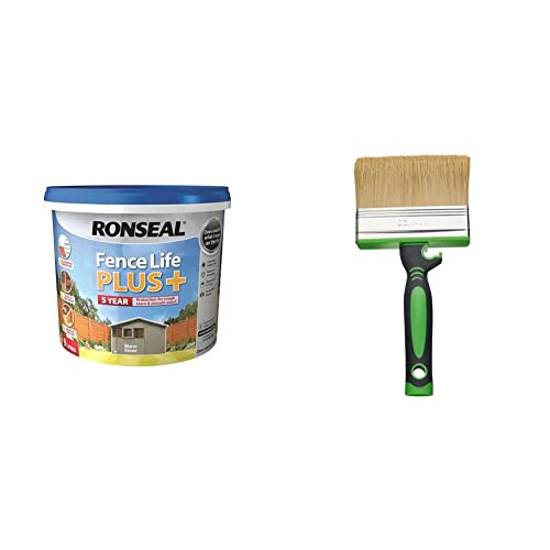 Ronseal RSLFLPPWS5L Fence Life Plus, Warm Stone, 5 Litre & Fit for The Job 4 inch Large Capacity Shed and Fence Block Brush