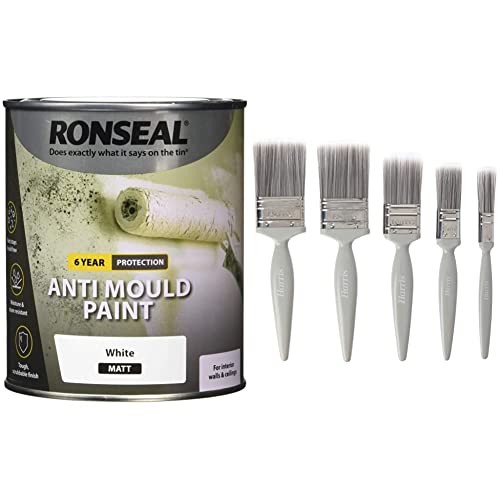 RONSEAL AMPWM750 Anti Mould Paint White Matt 750ml and Harris Essentials Walls & Ceilings Paint Brush Set | Pack of 5 | 0.5", 1", 1.5", 2"