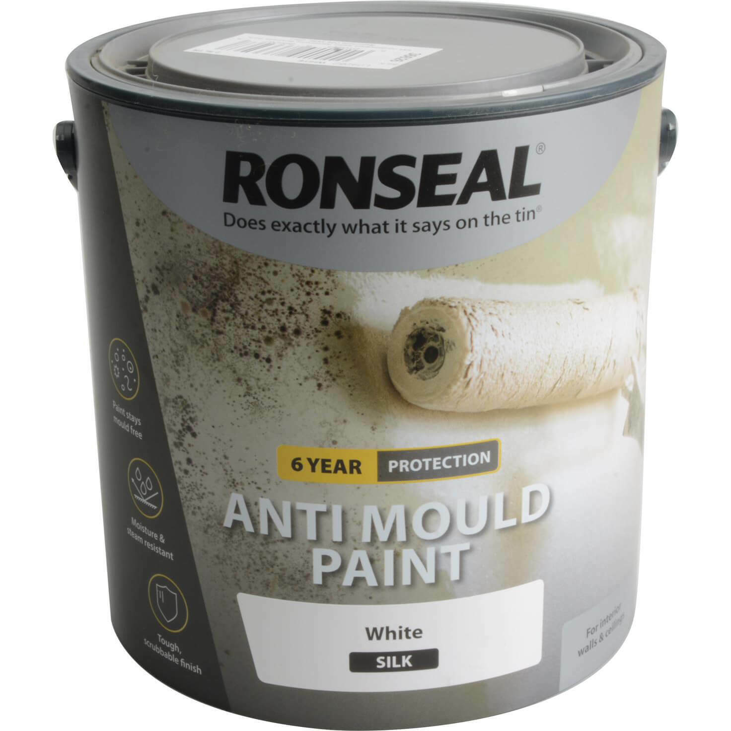 Ronseal 36626 6 Year Anti-Mould Paint White Silk 2.5L (RSLAMPWS25L) - Mould-Proof Emulsion, Quick Dry, Moisture Resistant