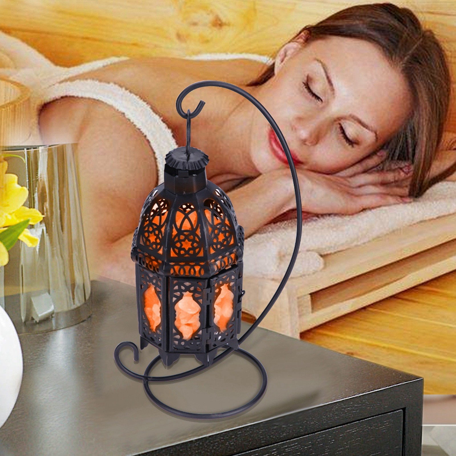 (Black)Vintage Iron Frame Natural Crystal Salt Rock Lamp Air Purifier Room SG