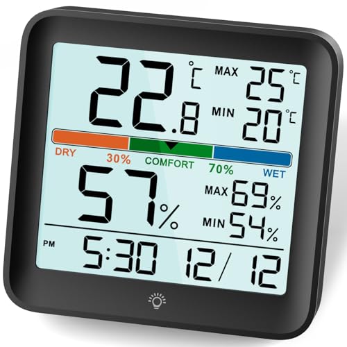 NOKLEAD Room Thermometer Hygrometer,Digital Indoor Thermometer with Max Min Records Light Air Comfort Clock Temperature Monitor Humidity Meter for Greenhouse Baby Room Bedroom,Black