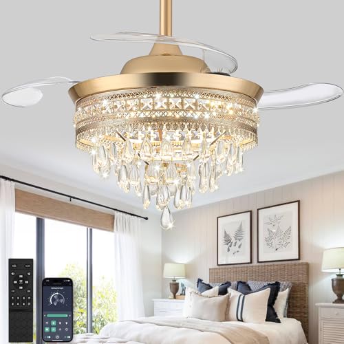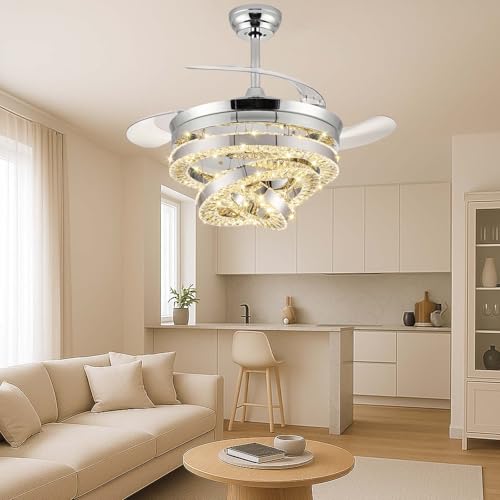 42 Inch Ceiling Fans with Lights and Remote Dimmable Crystal Chandelier Ceiling Fan Bladeless Modern Crystal Ceiling Fan for Bedroom Living Room Dining Room Fan Light with Reversible & 6 Speeds