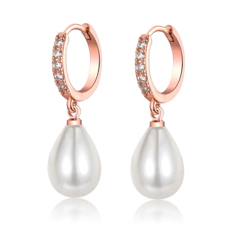 Pearl Dangle Earrings for Women, Sterling Silver Pearl Drop Hoop Earrings, Hypoallergenic Teardrop Pearl Rose Gold Hoop Earrings with AAA+ Cubic Zirconias | Jewellery Gifts for Birthday Weeding