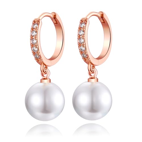 Pearl Dangle Earrings for Women, Sterling Silver Pearl Drop Hoop Earrings, Hypoallergenic Round Pearl Rose Gold Hoop Earrings with AAA+ Cubic Zirconias | Jewellery Gifts for Birthday Weeding