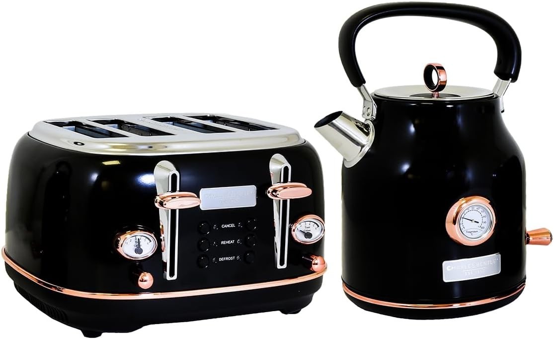 Charles Bentley 1.7L Kettle & 4 Slice Toaster Set Black & Rose Gold Fast Boil 36