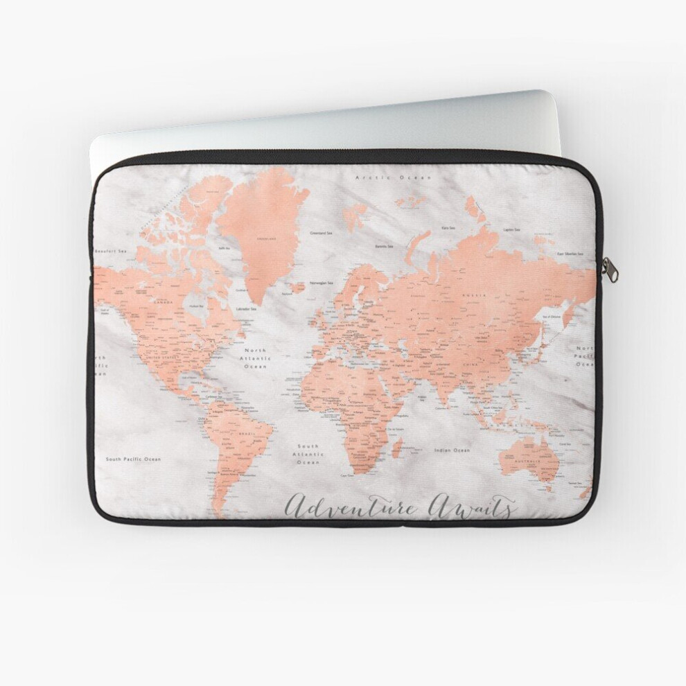 Laptop Sleeve Adventure awaits world map in rose gold and marble, "Janine" 10 12 13 15 17 Inch Case Notebook Tablet Carrying Bag Cover