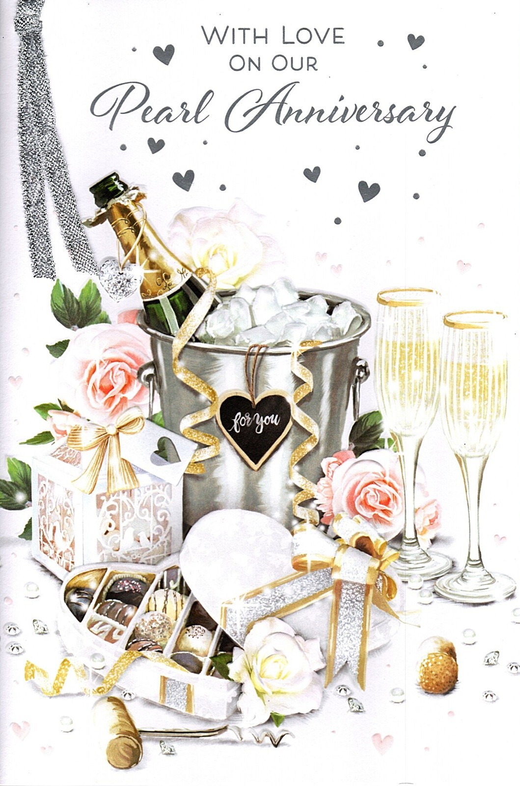On Our Pearl 30th Anniversary Card Champagne Chocolates Hearts Roses Silver Foil