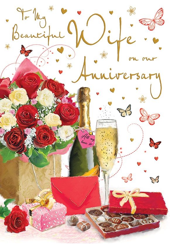 Wedding Anniversary Card - Wife Roses Champagne Chocolates - Glitter - Regal NEW