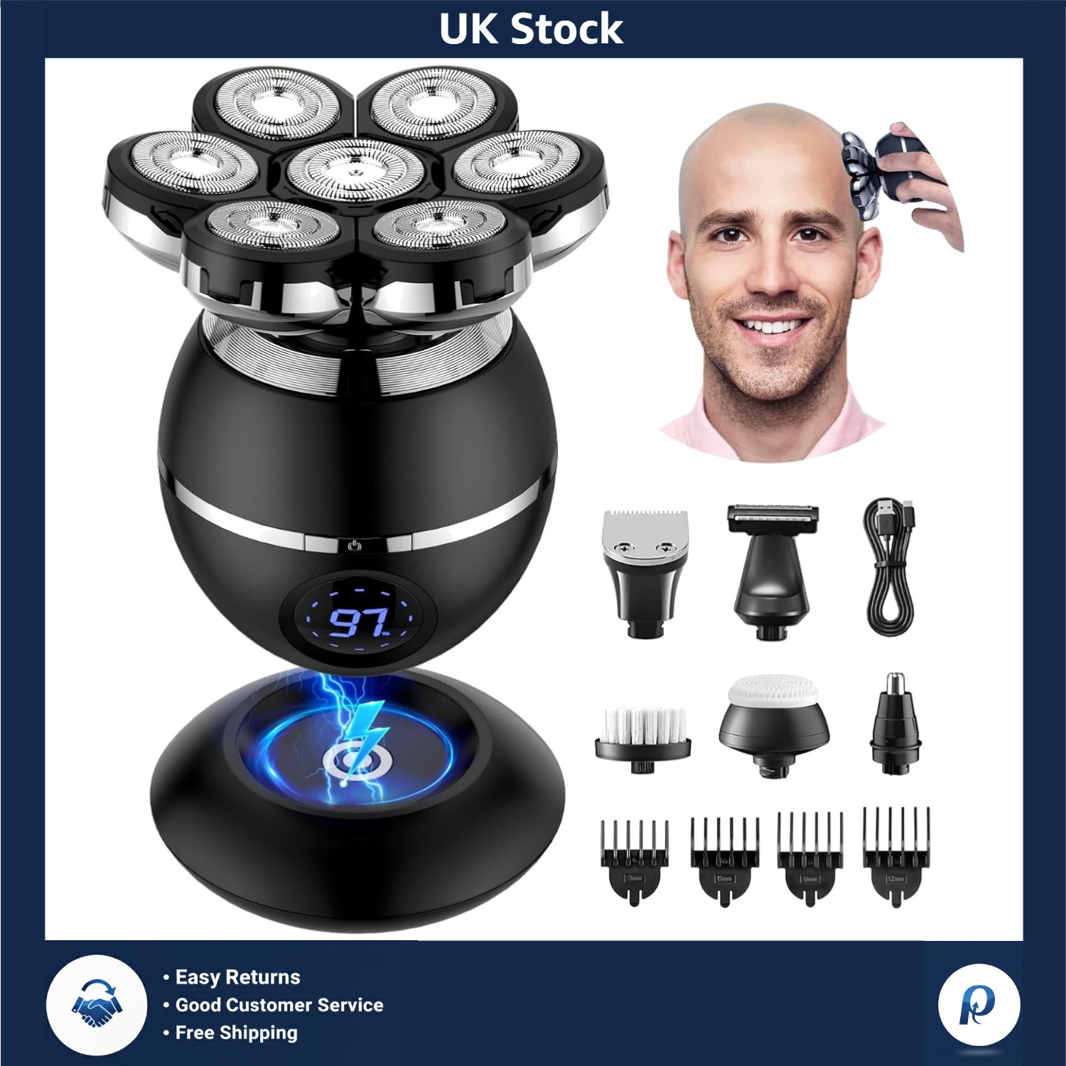 Unbranded 5-in-1 Electric Head Shaver for Bald Men - 7D Floating Head, Wet & Dry, Rotary Shaver, Nose Trimmer, Hair Clipper, Facial Brush, Body Trimmer