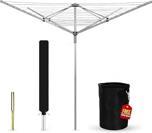 Heavy Duty Rotary Washing Line Outdoor, 4 Arm 50M Washing Line Rotary with Peg Bag, Metal Ground Spike, and Cover Included, Rotary Clothes Lines for Outside, Whirlygig Clothes Airer Outdoor