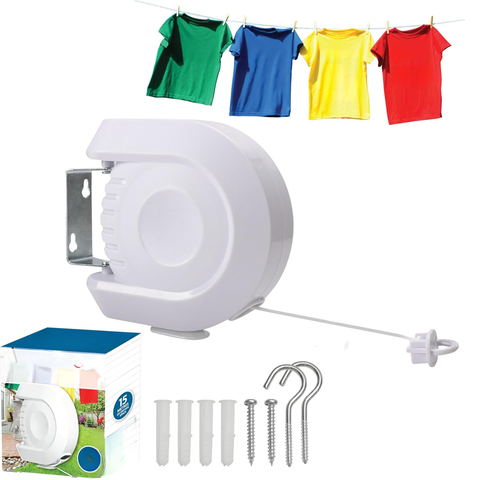 G4GADGET Outdoor Retractable Clothes Line 15m – Heavy Duty Retractable Washing Line with Pins, Space-Saving Wall-Mounted Clothes Dryer for Indoor & Outdoor Use, Grey
