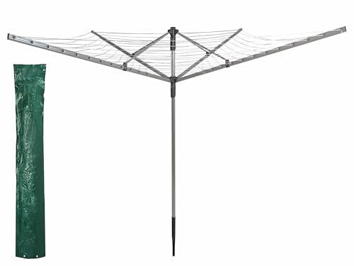 Byinone Rotary Washing Line | 50m Rotating Heavy Duty Clothes Airer Outdoor | Garden 4 Arm Rotary Washing Line | Outdoor use with Ground Spike Aluminium + Cover