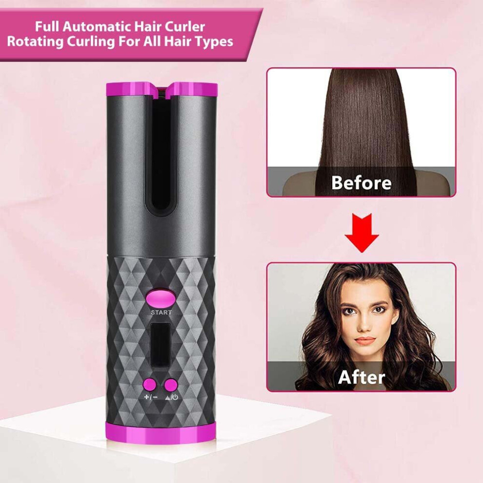 (Pink) Cordless Hair Curler Ceramic Curly Rotating Curling Iron Curls