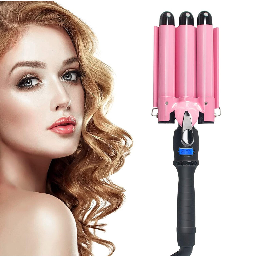 Automatic Rotating Curling Wand with LCD Display, Adjustable Temperature, Ceramic, Pink