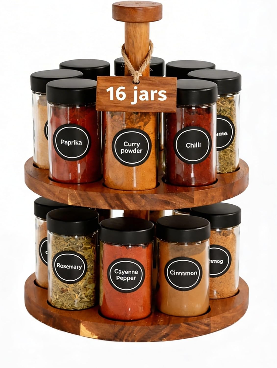 Elite Creations Acacia Wood 2-Tier Rotating Spice Rack with 16 Glass Jars