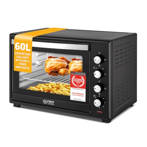 TZS First Austria Electric Oven 60L, 2000W Worktop Oven with Convection & Rotisserie, 100–230 °C, Timer, Top&Bottom Heat, 4 Shelf Levels, Accessories