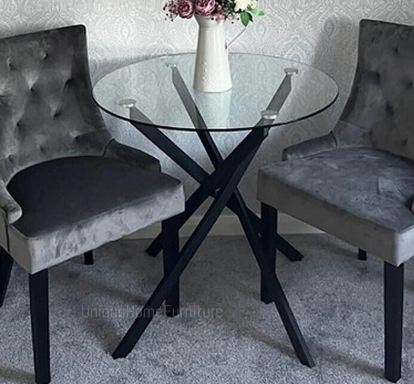 Novara 4 Seater Black Leg Round Glass Dining Table & 4 Pesaro Soft Velvet Black Leg Chairs