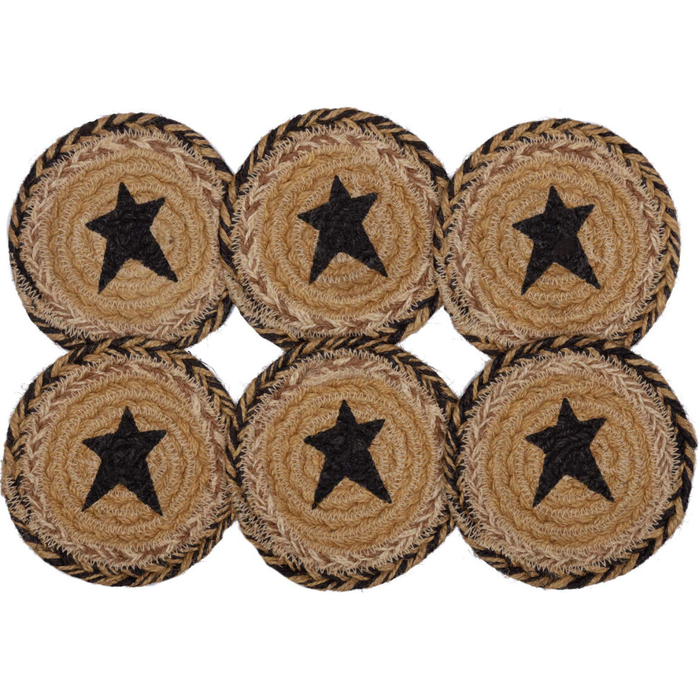 VHC Brands Kettle Grove Primitive Jute Tan Textured Round Kitchen Coaster Stencil Star Set of 6 4""""