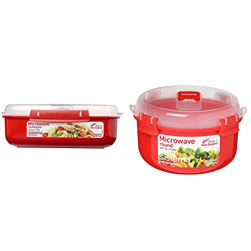 Sistema Microwave Round Food Container/Cookware Bowl | 1.3 L Food Steamer | Red/Clear & Rectangle Microwave Container | 1.25 L | BPA-Free | Red/Clear