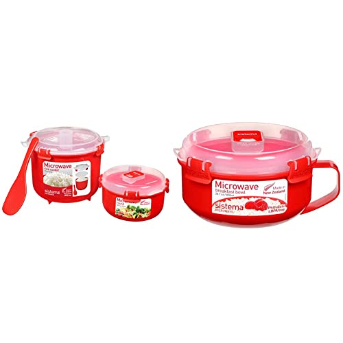 Sistema Microwave Rice Cooker | 2.6 L | Dishwasher Safe Small Rice Cooker| Red & Microwave Breakfast Bowl | Round Microwave Container with Lid & Steam Release Vent | 850 ml | BPA-Free | Red | 1 Count